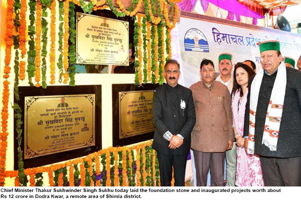 शिमला: मुख्यमंत्री ठाकुर सुखविंद्र सिंह सुक्खू ने आज शिमला जिला के दूरदराज क्षेत्र डोडरा क्वार में लगभग 12 करोड़ रुपये की परियोजनाओं के शिलान्यास और उद्घाटन किए। उन्होंने 5.43 करोड़ रुपये की लागत से बने गोसांग-जिसकुन सड़क का लोकार्पण किया, जबकि 5.46 करोड़ रुपये की लागत से बनने वाले डोडरा-चमधार सड़क तथा 85 लाख रुपये की लागत से बनने वाली गोसांग-हरली सड़क की आधारशिला भी रखी।